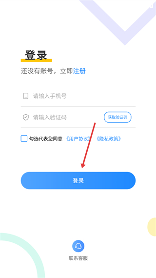 1、登錄頁,采用手機號加驗證碼登錄,需勾選用戶協議與隱私政策,底部設聯系客服入口,方便用戶咨詢問題。