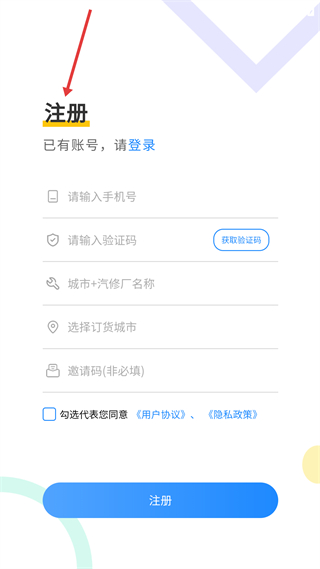 2、注冊頁,需填手機號等信息,補充汽修廠相關內容,邀請碼非必填,適配行業用戶的注冊需求。