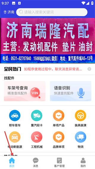 3、首頁,定位濟南,展示本地汽配商信息,提供找配件功能,分類覆蓋多類車型及汽配服務。