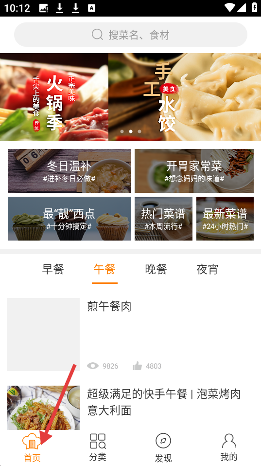 1、首頁有搜索欄展示火鍋季、手工水餃等專題,分冬日溫補等板塊,還有早午晚餐推薦如煎午餐肉等。