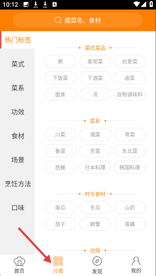 2、分類頁面設熱門標簽,從菜式菜系到功效等維度分類,菜式含粥、家常菜等,菜系覆蓋川菜西餐等多種類別。