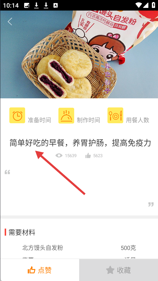 3、菜譜頁面呈現美食圖片,標注準備和制作時間等,有食材明細,如北方饅頭自發粉等下方有點贊和收藏功能。