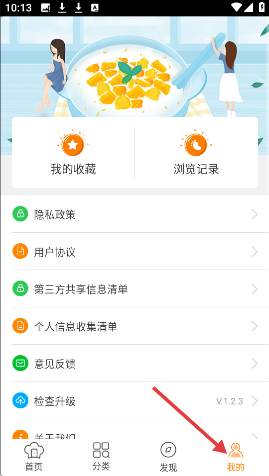 4、我的頁面含我的收藏、瀏覽記錄,還有隱私政策等選項,可進行意見反饋、檢查升級等操作管理個人相關設置。