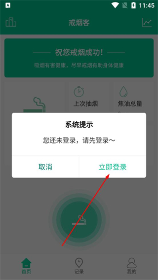 1、打開戒煙客軟件,進入首頁查看今日抽煙量等數據,點擊頁面中的抽煙圖標,觸發系統提示彈窗,提示需先登錄賬號。
