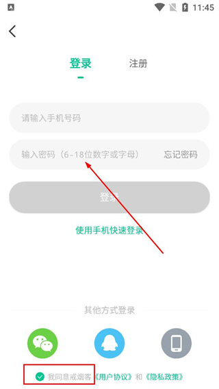 3、勾選同意相關協議,輸入手機號密碼或其他方式登錄,登錄后選擇香煙品牌并確認打卡日期,完善抽煙相關信息。