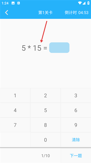 4、闖關模式第1關卡的答題界面,展示計算題目,配備數字鍵盤與倒計時功能,按題序作答,適配闖關式計算能力訓練。