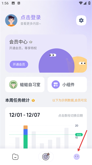 1、個人中心界面含會員開通入口、任務統計模塊,展示本周任務數據會員可見,是個人任務管理與會員服務的綜合頁面。