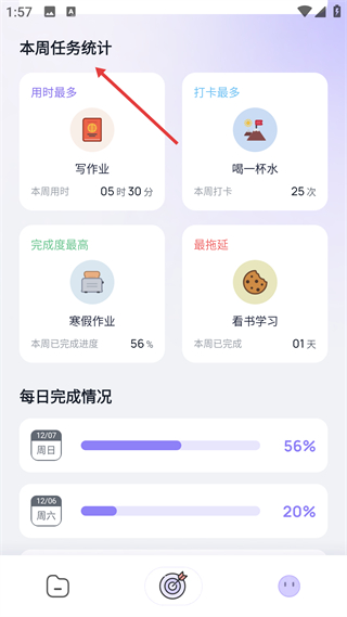2、本周任務統計界面分類展示任務數據,含每日完成情況進度條,幫助用戶清晰了解用時、打卡等任務的執行狀態。