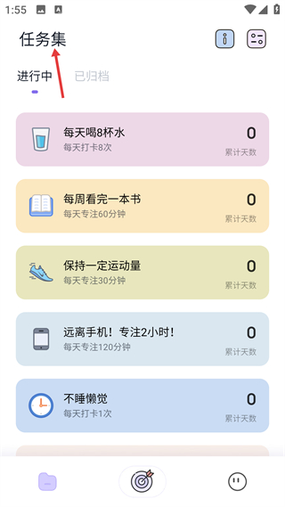 3、任務集界面管理進行中/已歸檔任務,包含喝水、閱讀等習慣類任務,標注每日打卡要求,是任務清單的集中管理頁。