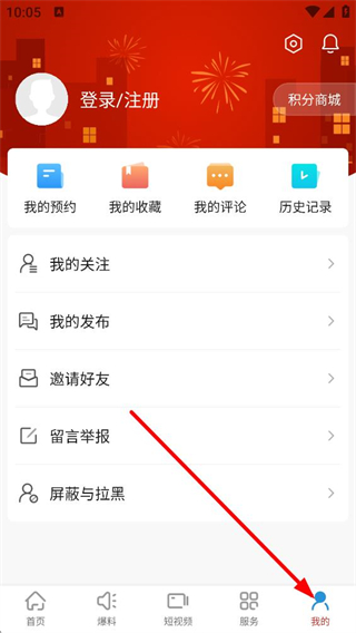 2、點擊底部我的按鈕,進入個人頁面,可進行登錄、注冊,使用我的預約、我的收藏等功能,還能參與積分商城活動。
