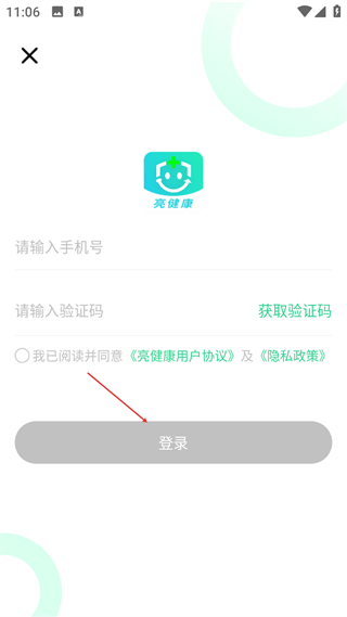 1、進入亮健康先到登錄頁面,需輸入手機號和驗證碼,勾選我已閱讀并同意相關協議后,點擊登錄按鈕,完成賬號的登錄操作。