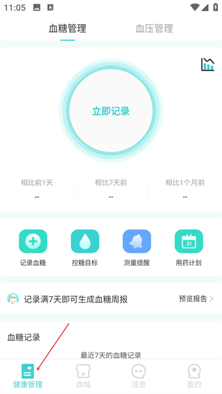 2、登錄后進入健康管理界面,可切換血糖管理或血壓管理分類,點擊立即記錄按鈕,使用記錄血糖等功能完成健康數據的管理。