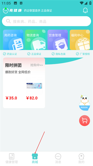 3、切換到商城界面,可通過搜索欄查找疾病藥品等商品,瀏覽限時拼團活動,借助用藥咨詢等功能獲取對應的服務內容。