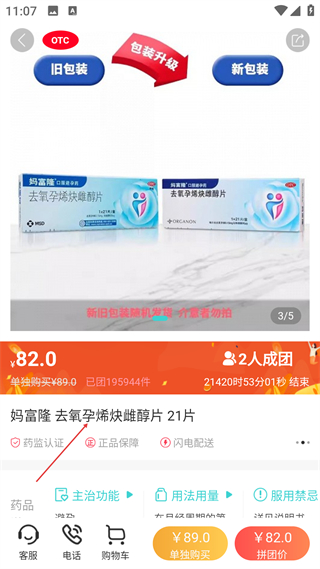 4、進入商品詳情頁,可查看藥品的新舊包裝信息,了解價格及拼團規則,選擇單獨購買或拼團價的方式完成該藥品的下單。