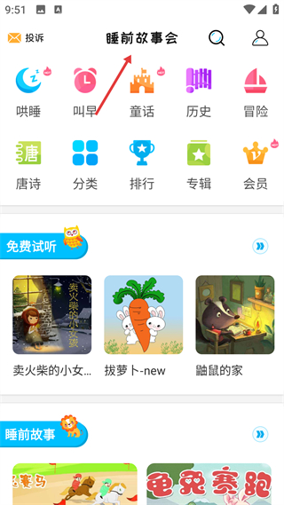 1、睡前故事會主界面,含哄睡、童話等分類入口,展示免費試聽與睡前故事內容,助力快速找到適配兒童睡前的音頻故事。