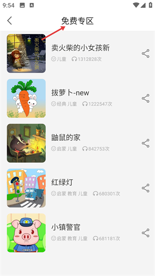 2、免費專區頁,集合賣火柴的小女孩等免費故事,標注收聽次數與分類標簽,提供零門檻的啟蒙故事資源。