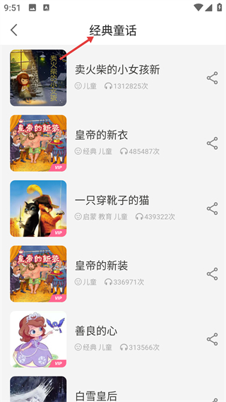 3、經典童話頁,含皇帝的新衣等故事,部分標注VIP區分權限,聚焦經典童話品類滿足兒童收聽需求。