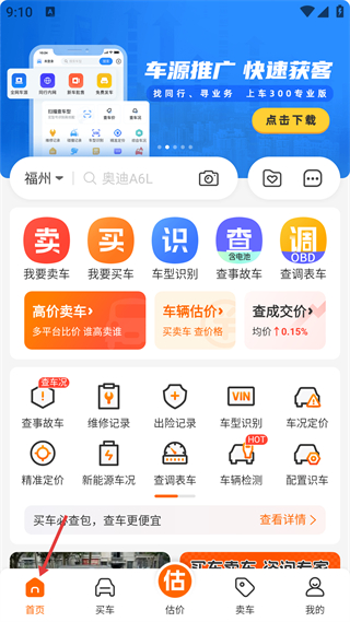 1、首頁,聚合賣車、買車功能,含查車況等工具,底部首頁是功能入口,助力用戶快速獲取二手車服務。