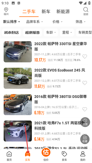2、買車頁,展示福州二手車列表,含車型、里程等信息,標注估值,底部買車是選車功能入口。
