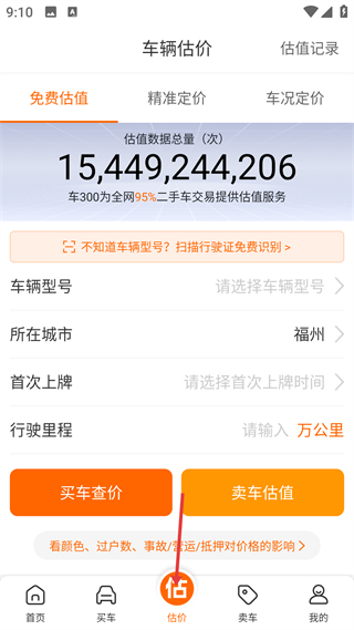 3、估價頁,提供免費估值服務,支持填車輛信息查價格,累計超150億次估值,底部估價是定價入口。