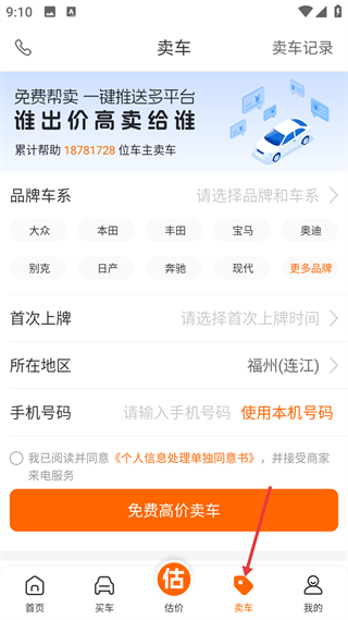 4、賣車頁,提供多平臺幫賣服務,需填車輛信息與手機號,助超1800萬車主賣車,底部賣車是賣車入口。
