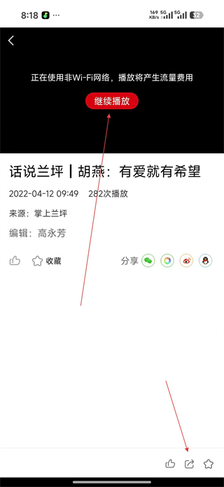 3、在提示頁面點擊繼續播放按鈕,開始播放該視頻內容,還可以點擊下方分享按鈕。