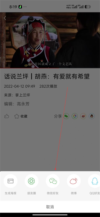 4、在視頻播放頁面找到分享按鈕,點擊彈出分享選項界面,選擇微信好友等方式,將該視頻分享給好友。