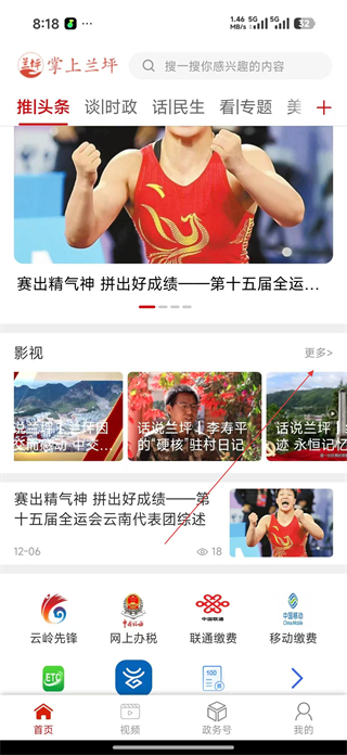 1、打開掌上蘭坪軟件,進入首頁后找到影視板塊的更多按鈕,點擊該按鈕,進入話說蘭坪的視頻列表頁面。