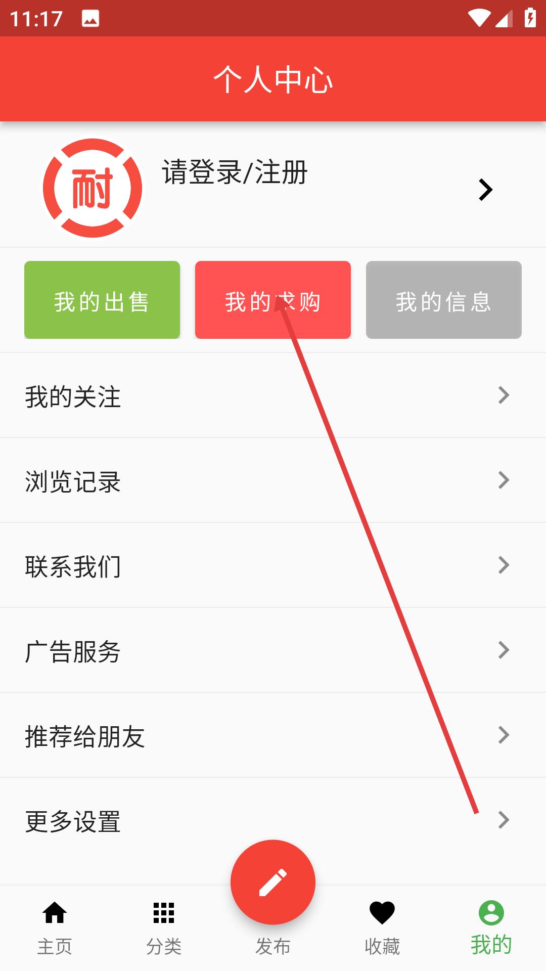 2、同意相關協議后,進入個人中心頁面,這里有我的出售,我的求購等功能按鈕,以及我的關注,瀏覽記錄等個人相關選項。