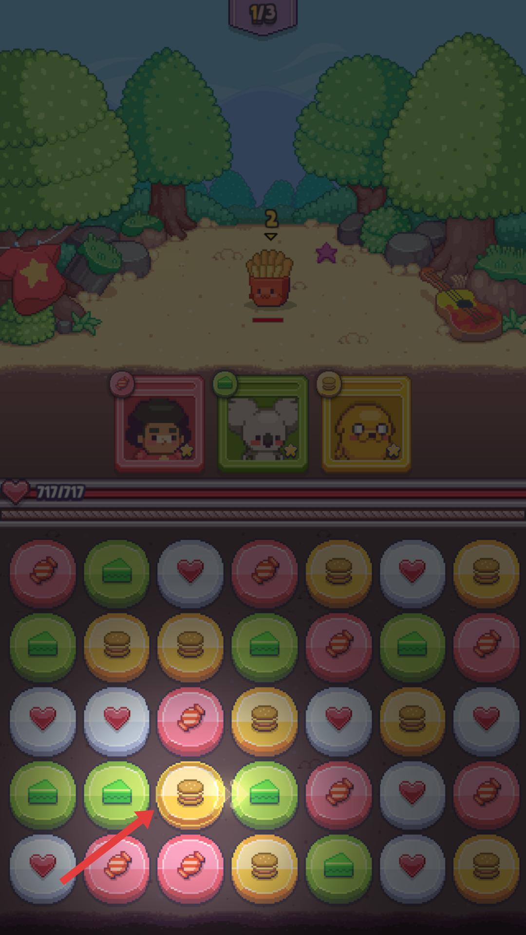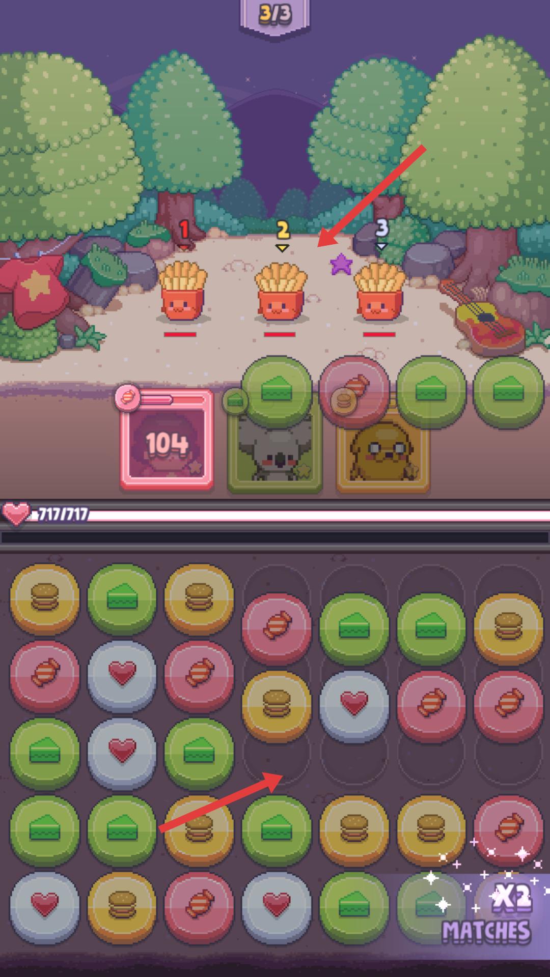 3、面對多個薯條敵人時,通過消除下方對應圖標,可對敵人造成群體傷害,同時注意敵人的血量,合理規劃消除策略。