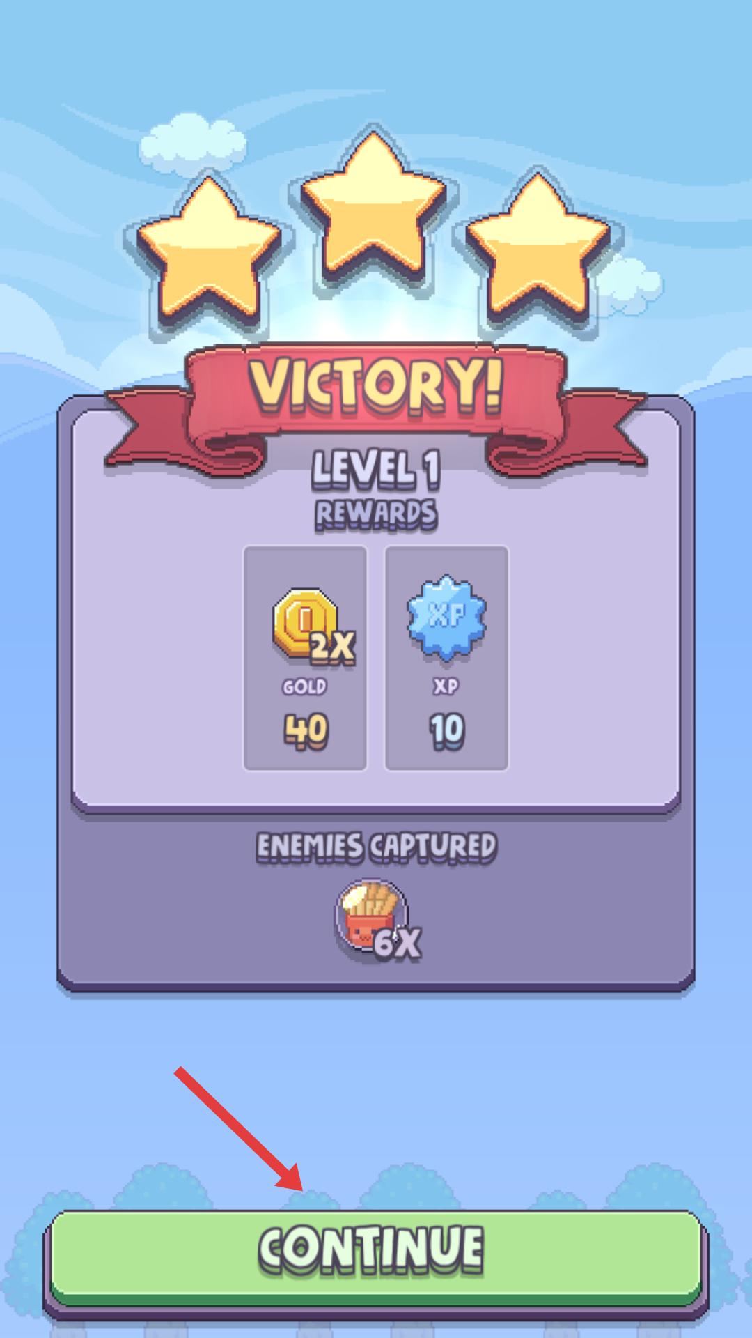 4、關卡勝利后,會顯示VICTORY界面,獲得金幣、經驗等獎勵,點擊CONTINUE按鈕,可繼續下一關的游戲挑戰。