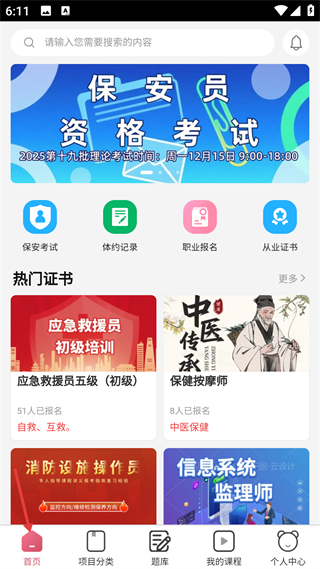 1、進入熊學職業培訓平臺首頁,可見保安考試體約記錄等功能按鈕,還有熱門證書板塊展示應急救援員等培訓項目,可選擇對應功能或證書,了解相關培訓內容。