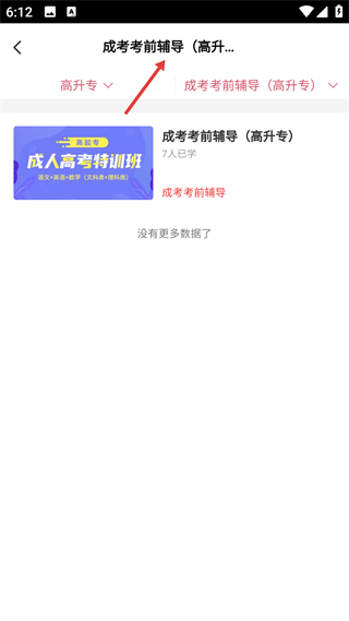 3、進入成考考前輔導高升專頁面,可看到成考考前輔導特訓班課程,該課程已有7人學習,能查看課程對應的輔導類別等信息。