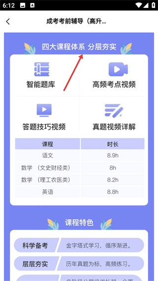4、進入課程詳情頁面,可見四大課程體系,包含智能題庫高頻考點視頻等內容,還有各科目課程時長及課程特色,可了解課程的具體配置。