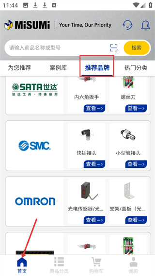 1、首頁有搜索欄,推薦品牌含世達、SMC、歐姆龍等,展示內六角扳手、快插接頭等工業用品,功能入口清晰。