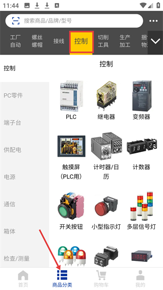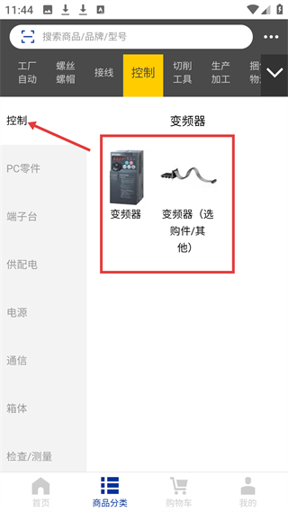 2、商品分類頁,分類有工廠自動等,控制分類下展示PLC、繼電器、變頻器等工業控制設備,便于查找品類。