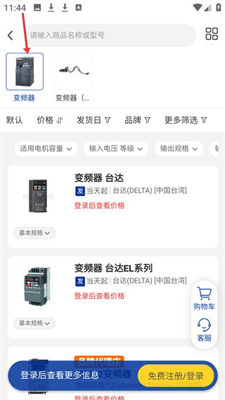 4、變頻器商品頁,展示臺達、臺達EL系列等變頻器,標注品牌產地,需登錄看價格,可按電機容量等篩選。