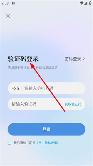 4、選擇驗證碼登錄時,輸入手機號碼和驗證碼,勾選同意用戶隱私政策后點擊登錄,未注冊手機號碼驗證后將自動注冊登錄。