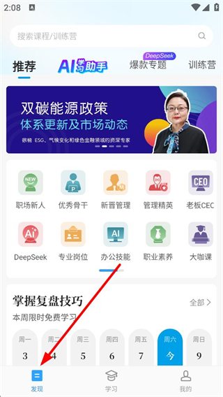 1、進入發現板塊,可搜索課程或訓練營,查看推薦、AI學習助手、爆款專題等內容,選擇職場新人、優秀骨干等不同學習分類,參與限時免費學習活動。
