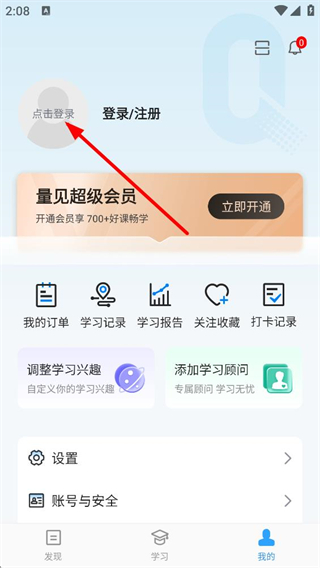 2、進入我的板塊,可點擊登錄、注冊,開通量見超級會員暢享好課,管理我的訂單、學習記錄、學習報告等,調整學習興趣,添加學習顧問,設置賬號與安全。