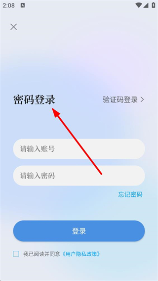 3、選擇密碼登錄時,輸入賬號和密碼,勾選同意用戶隱私政策后點擊登錄,若忘記密碼可進行找回操作。