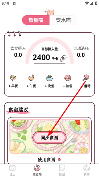 2、減肥喵頁面可查看目標攝入量,還能添加早餐午餐等飲食記錄及運動消耗,點擊同步食譜按鈕,可獲取對應的飲食方案建議。