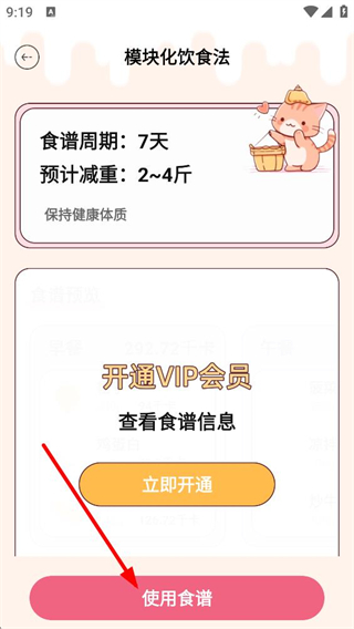 4、進入模塊化飲食法詳情頁可查看食譜周期及預計減重效果,若要使用該食譜,可點擊底部使用食譜按鈕,按提示完成后續操作。