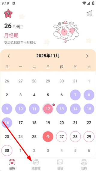 1、進入應用日歷界面可查看當前日期及經期狀態,界面展示當月日歷表,點擊底部減肥喵按鈕,即可進入飲食運動管理相關頁面。