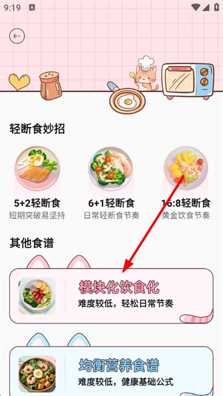 3、進入食譜頁面能看到多種輕斷食及其他食譜選項,模塊化飲食法等方案難度較低,適合日常節奏,可按需選擇對應的飲食方式。
