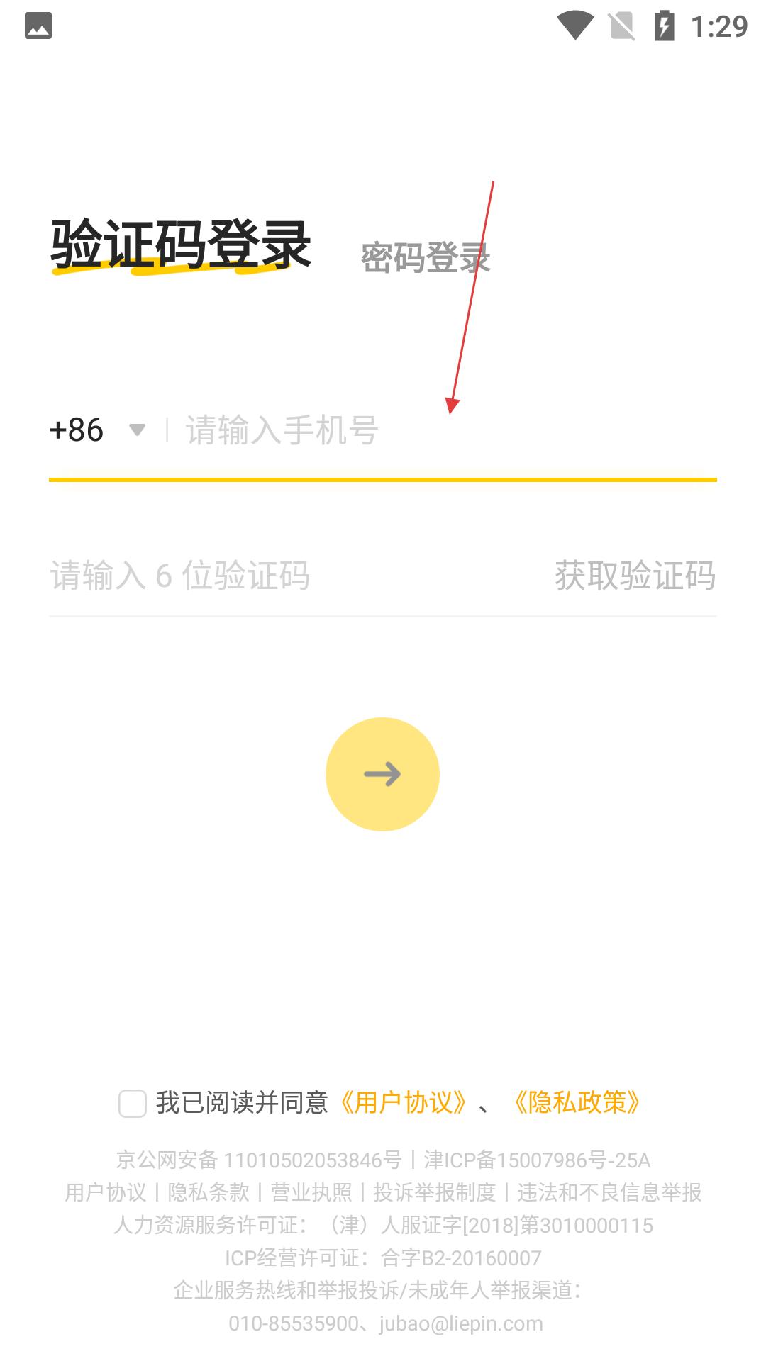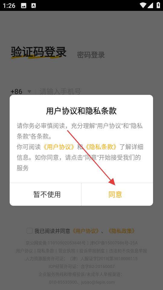 2、驗證碼登錄界面,用戶輸入手機號獲取驗證碼后可登錄,登錄前需勾選同意用戶協議和隱私政策。