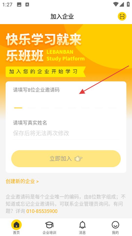 3、加入企業頁面,用戶填寫8位企業邀請碼和真實姓名后可點擊立即加入,也可選擇創建新的企業。