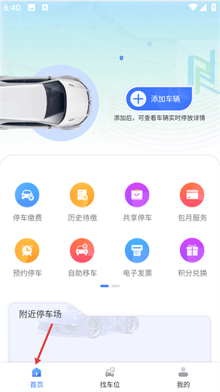 3、進入首頁,可使用停車繳費預約停車等功能,添加車輛查看實時停放信息,獲取附近停車場推薦。