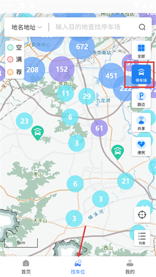 4、進入找車位頁,可在地圖查看停車場分布及車位余量,按目的地搜索,篩選停車場路邊車位等類型。