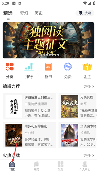 1、進入應用先進入精選頁面,設有精選奇幻歷史等頻道,含分類排行新書等功能入口,展示編輯力薦與火熱連載的小說內容,可瀏覽不同題材的作品選擇閱讀。